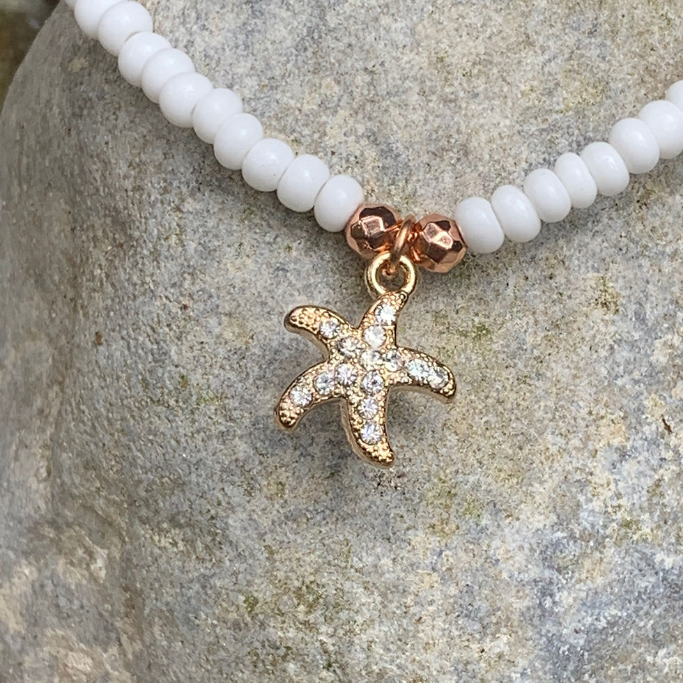 Rose Gold Plated Hematite Gemstones + White Seed Beads w Rhinestone Starfish Cha