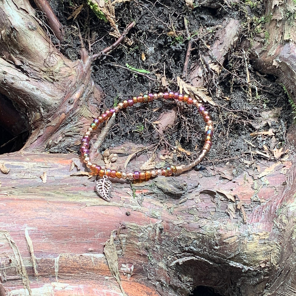 Rose Gold Hematite Gemstones + Mauve Seed Beads w Copper Leaf Charm + Rose Gold