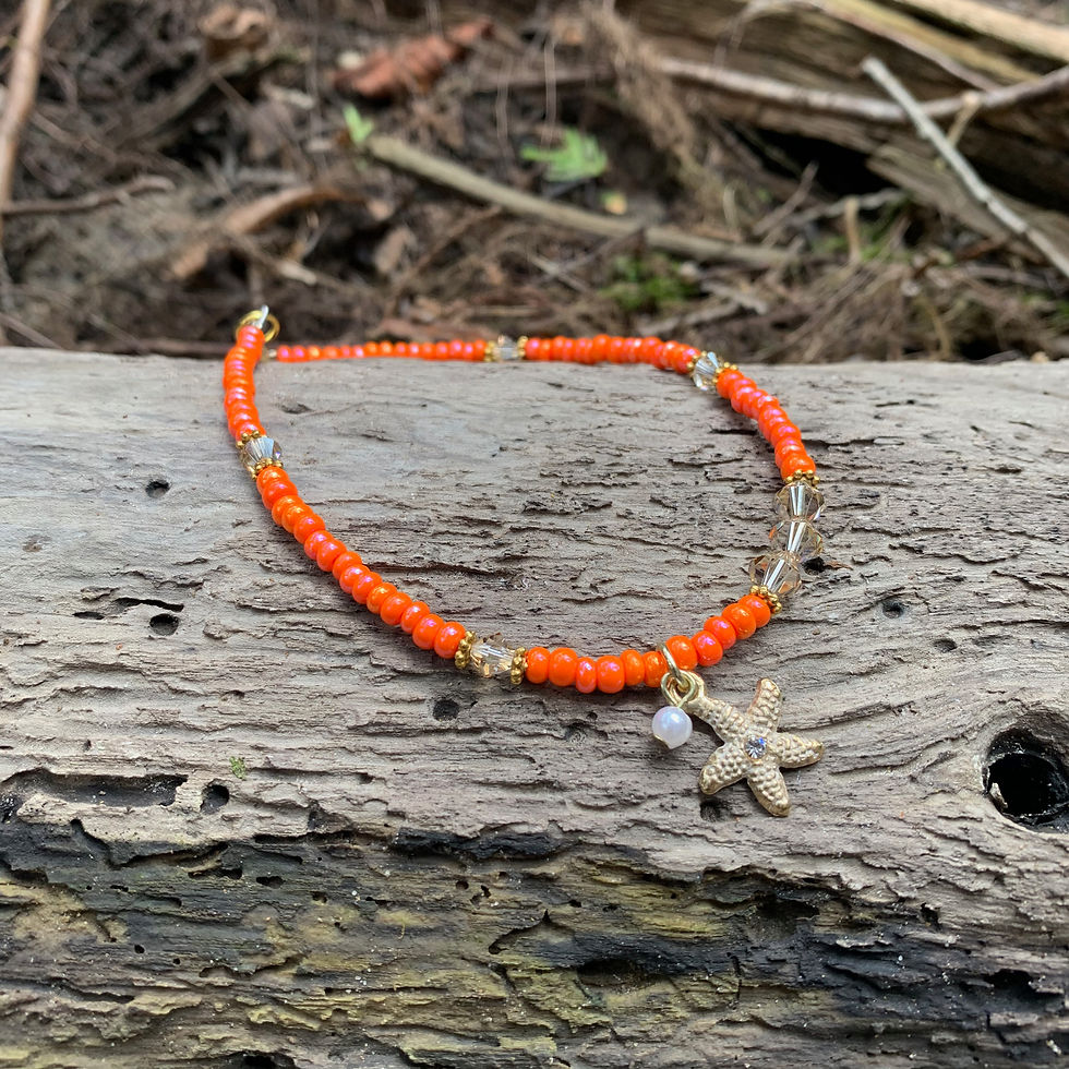 Taupe Swarovski Crystals + Tangerine Seed Beads w Gold Starfish, Clasp + Spacers