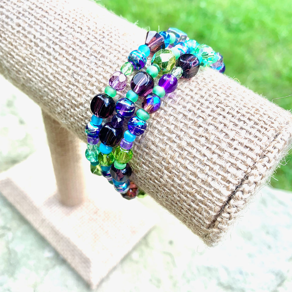 Memory Wire Wrap Bracelet w Assorted Glass + Seed Beads + Silver Charms