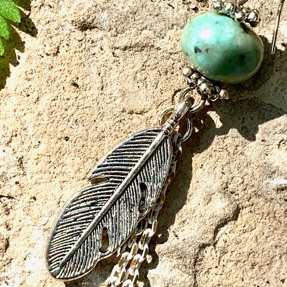 African Turquoise Feather Earrings w White-Gold Chain on Silver Hooks