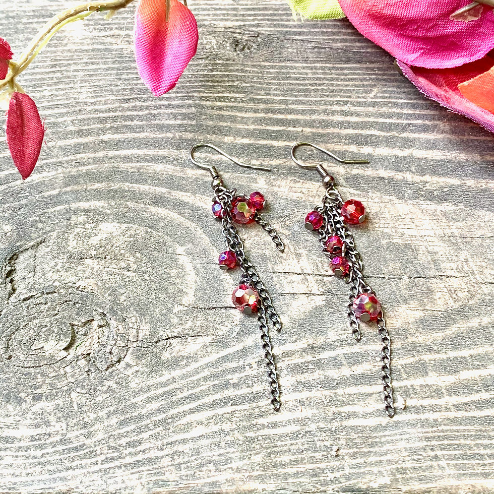 Raspberry Crystal Earrings on Gunmetal Chain + Hooks